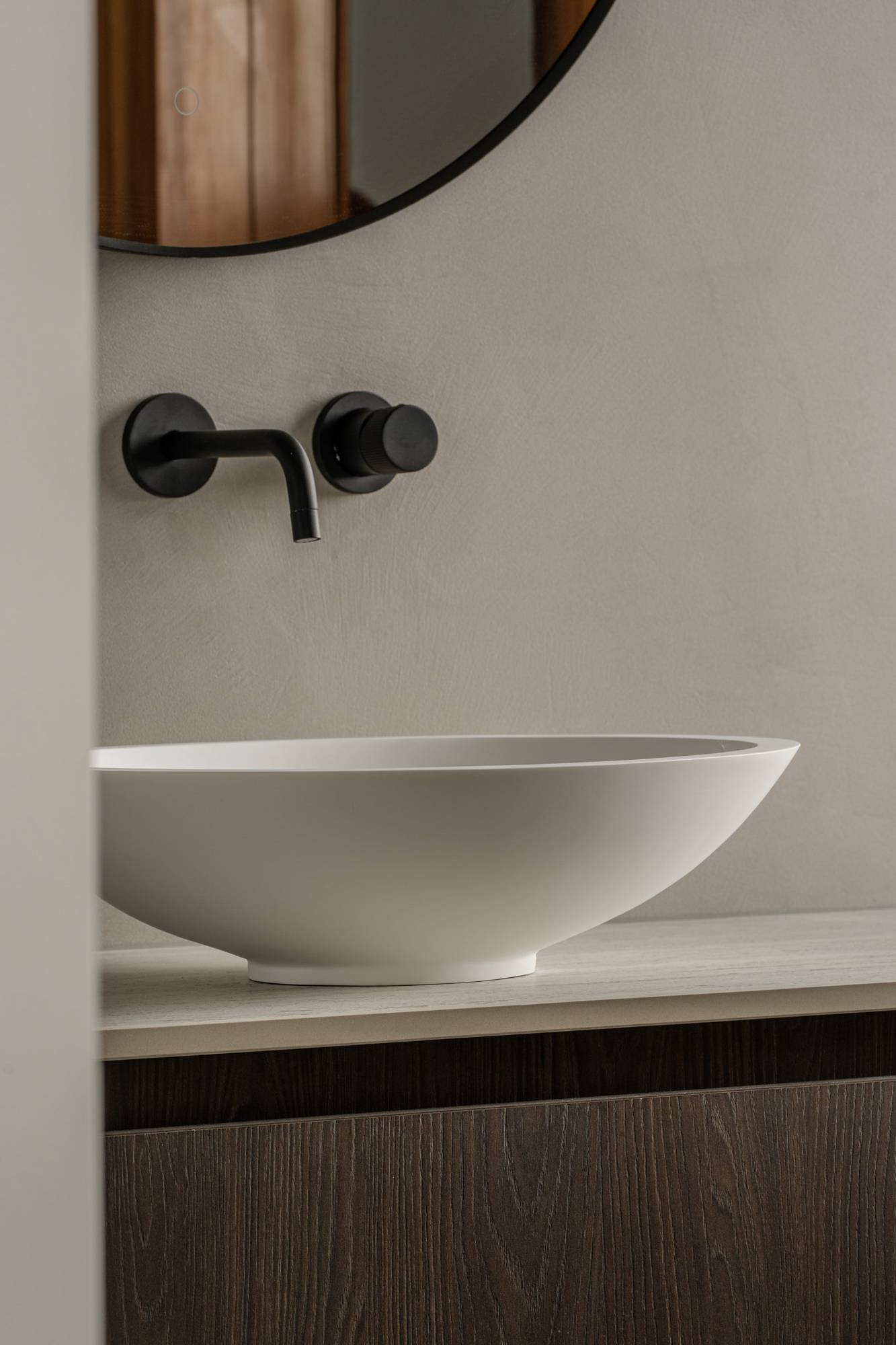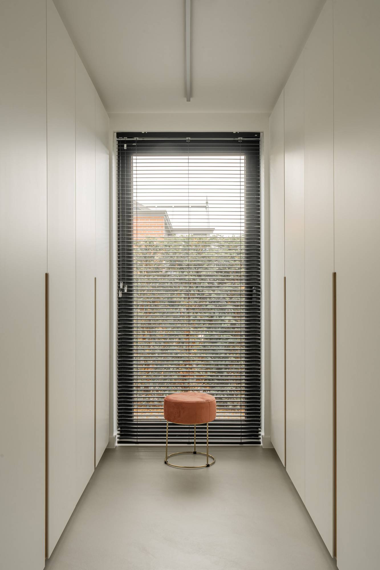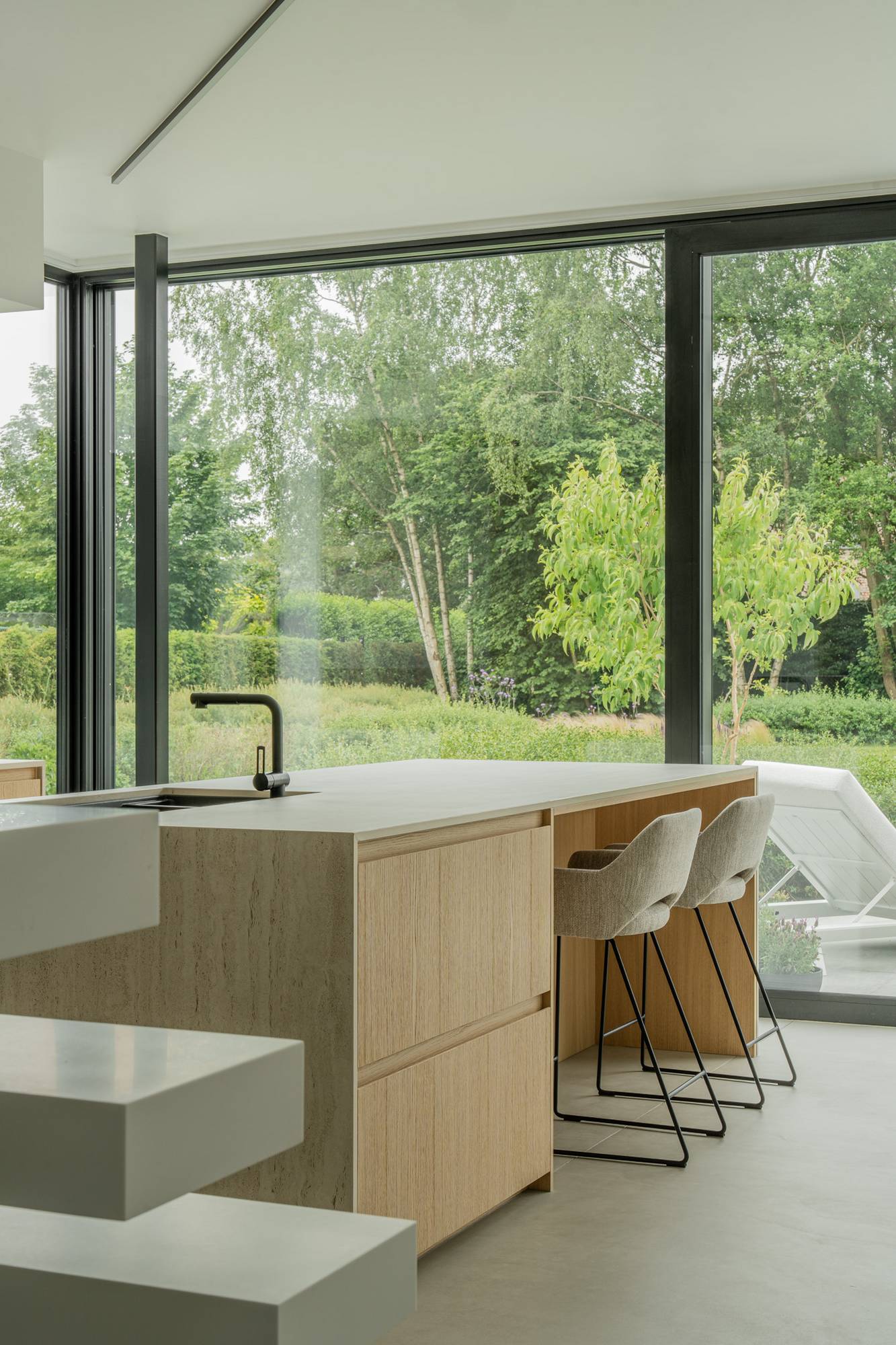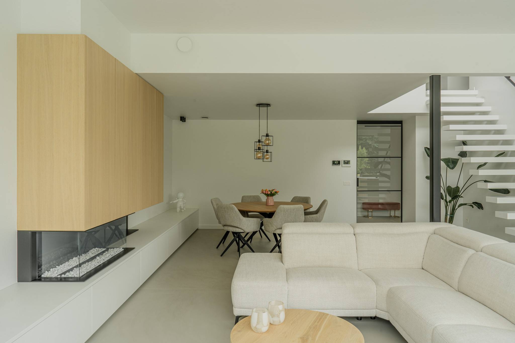 La combinaison de matériaux doux, de lumière naturelle et d’un sol en résine minérale présent dans toute la maison crée un intérieur où calme et cohérence s’imposent naturellement.