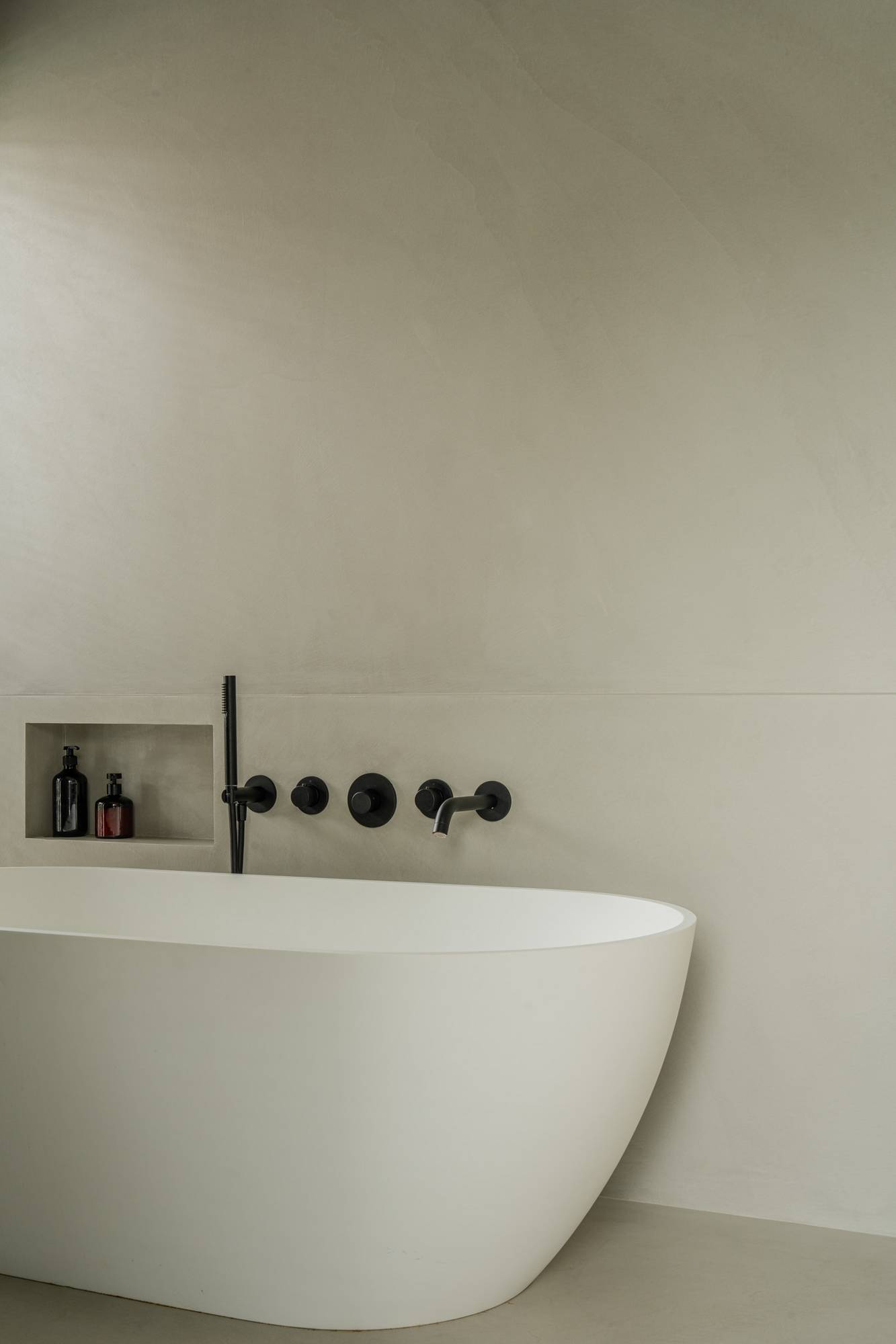 Dans la salle de bains, le même matériau a été prolongé sur les murs. Autour de la baignoire et dans la douche, cela crée une finition uniforme où sol et parois se fondent visuellement. Le résultat est un espace clair dans lequel les éléments sanitaires et le mobilier sur mesure sont mis en valeur.