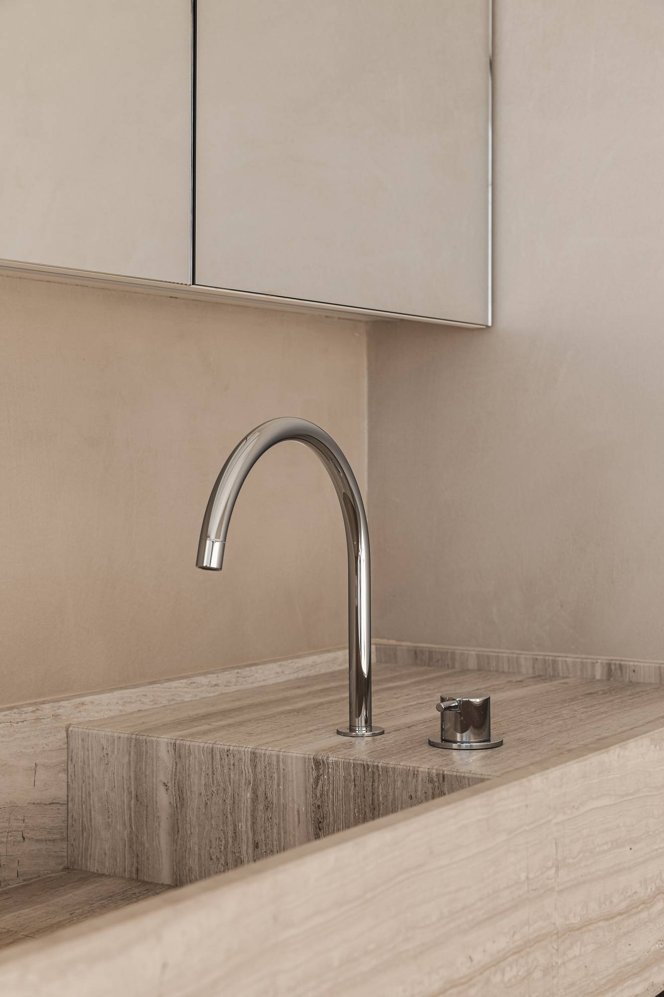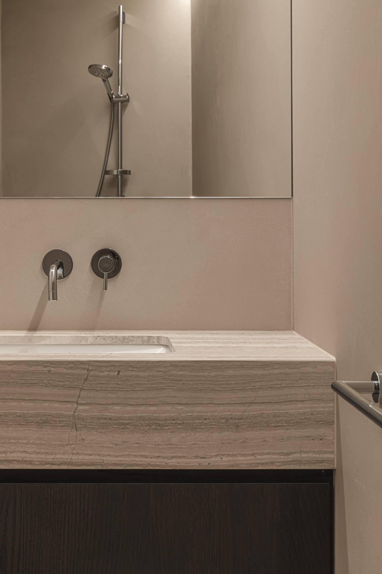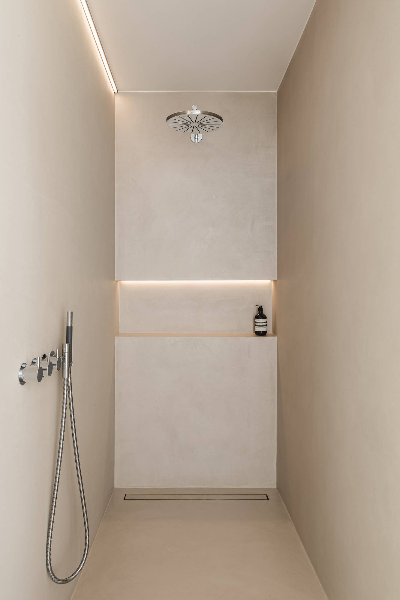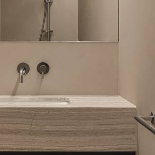 La finition sans joint contribue à l'uniformité des deux espaces. Il en résulte un sentiment de calme et d'harmonie, essentiel dans une salle de bains.