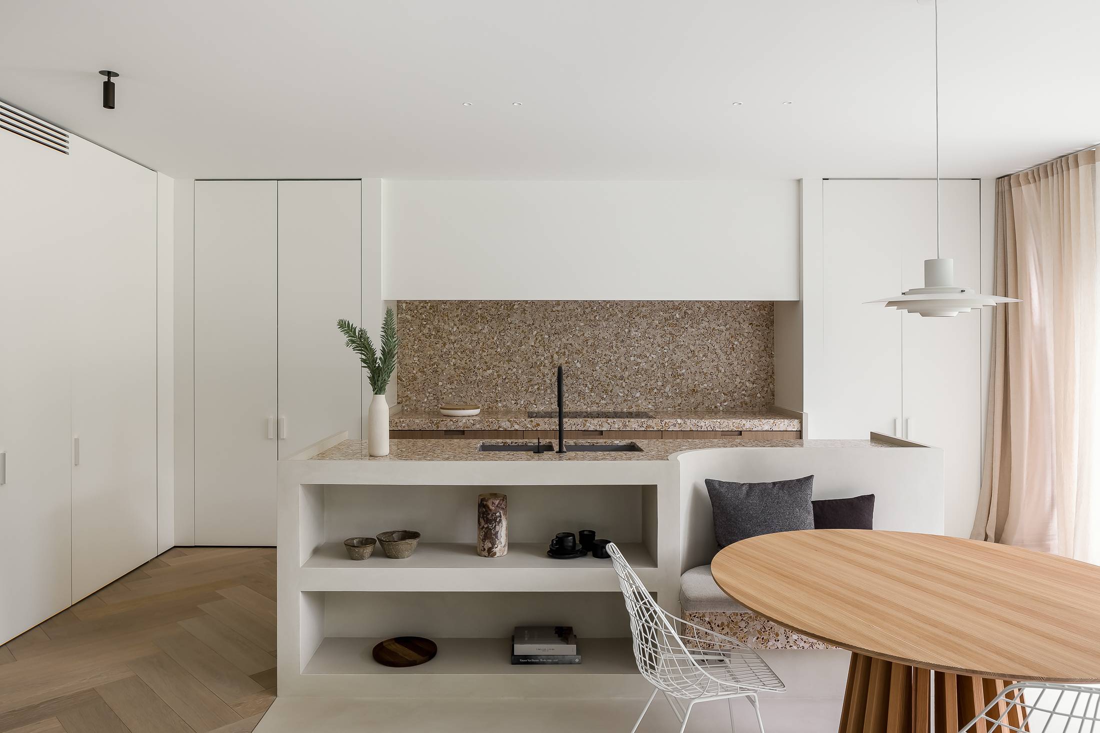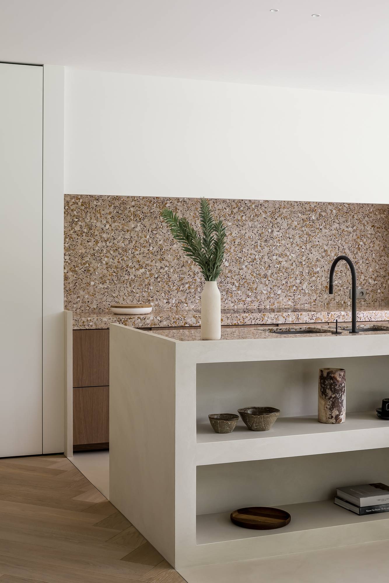 Cette sophistication se reflète dans la cuisine où ce sol en résine minérale est utilisé de manière créative pour relier des meubles sur mesure. Le sol se glisse sans effort dans le coin salon, ne fait qu'un avec le mobilier, puis se fond dans l'armoire encastrée pour une finition d'ensemble époustouflante. Cette intégration transparente permet non seulement d'allier confort et style, mais aussi de définir l'espace de manière unique.