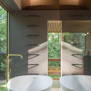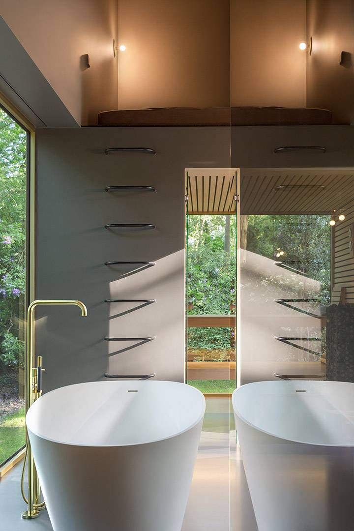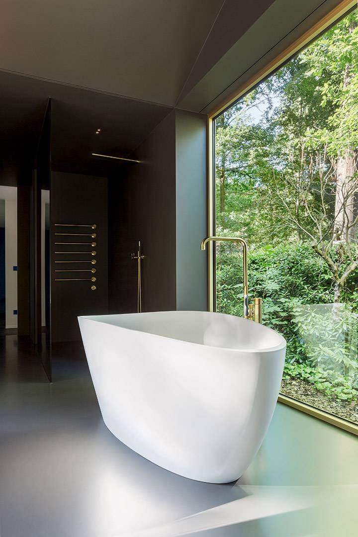 Pour ce projet à Aalter, Basil Architecture BV a opté pour une palette de couleurs atypique mais apaisante dans toute la maison. Pour la salle de bain et l'espace bien-être, une teinte chaude, luxuriante et chic a été choisie dans la collection Dark du Liquid Mellow. Enfin, le système Liquid Bathroom assure une transition fluide et silencieuse entre le sol et la douche à l'italienne.