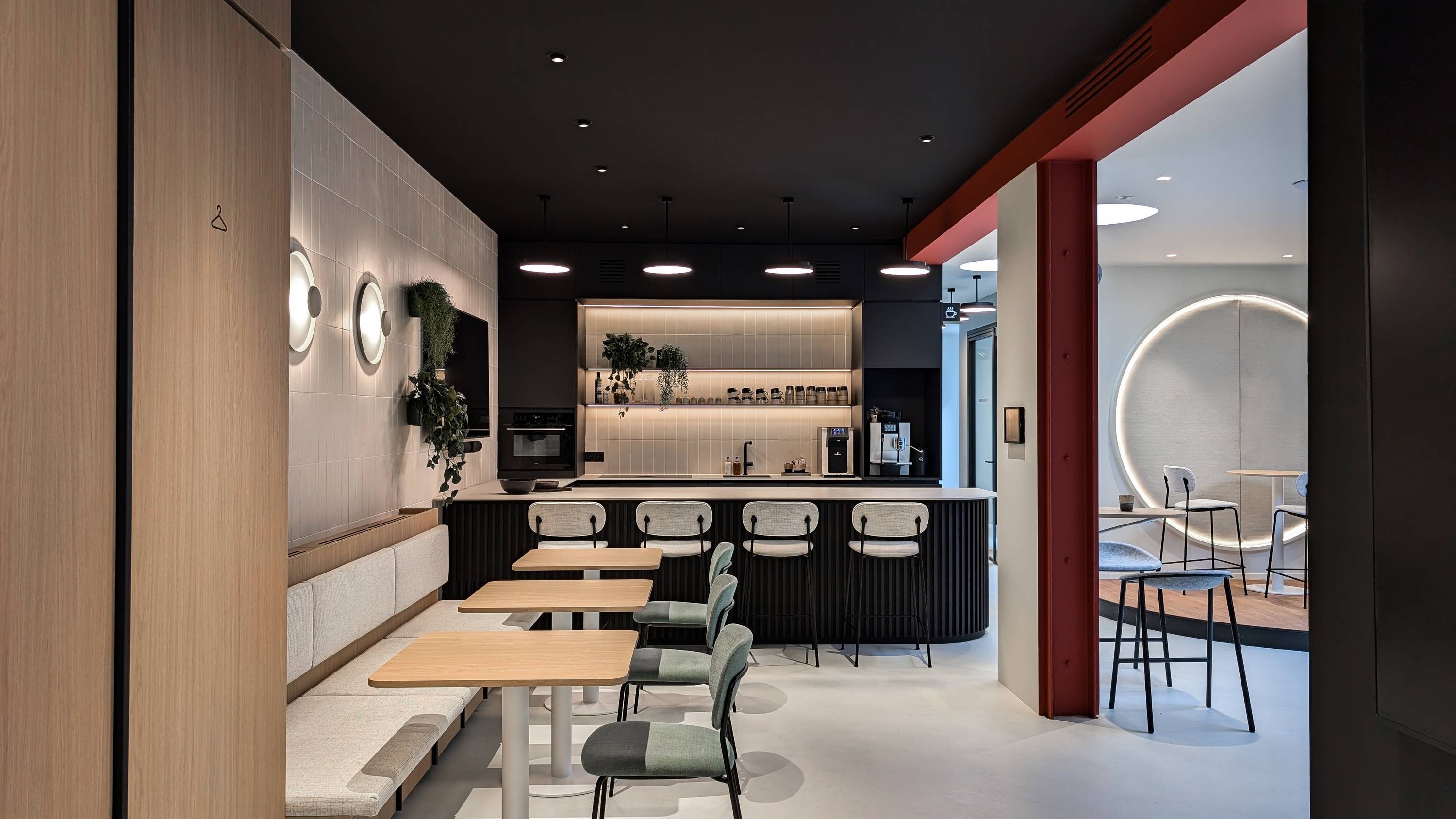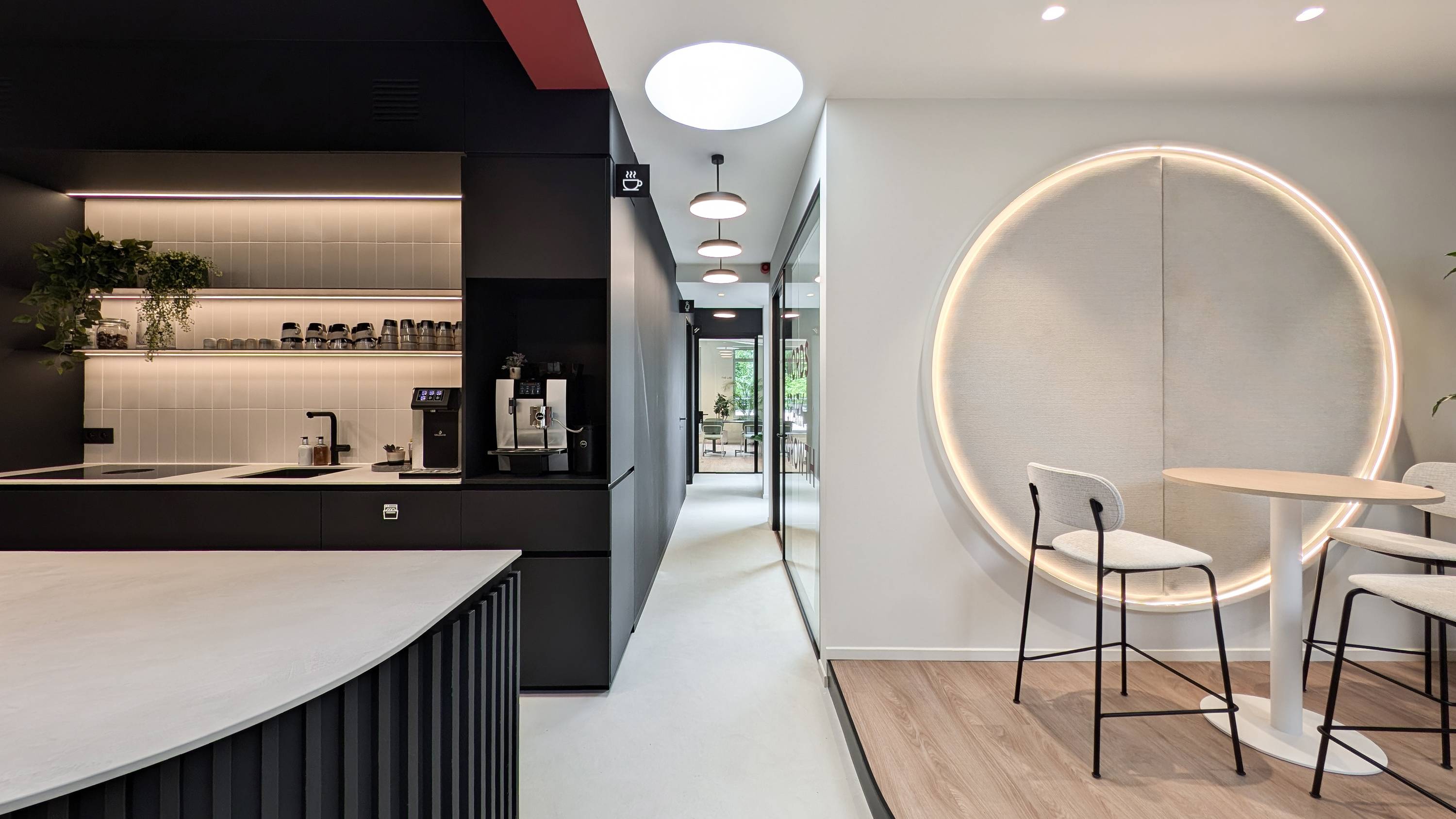 Doorheen de verschillende zones werd gekozen voor Socrete, een minerale harsvloer met een subtiel gespateld oppervlak. De vloer vormt een rustige basis die de verschillende delen van het kantoor met elkaar verbindt en tegelijk voldoende karakter heeft om de ruimte visueel te dragen. De April Sky tint geeft de vloer een zachte grijze uitstraling die mooi aansluit bij het lichte interieur, het hout en de donkere accenten in het maatwerk. Het oppervlak vangt het licht van de ronde daklichten en armaturen op een subtiele manier, waardoor de nuances van het materiaal zichtbaar blijven zonder dominant te worden.