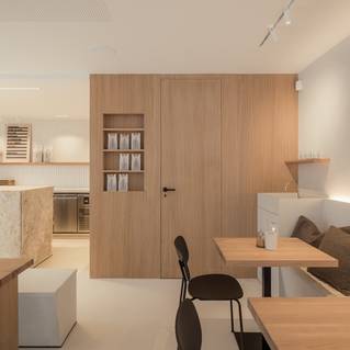 Het gebruik van de naadloze minerale Socrete afwerking maakt het ontwerp niet alleen esthetisch, maar ook zeer praktisch. Het is duurzaam, gemakkelijk te onderhouden en kan goed tegen intensief gebruik. Kortom, een ideale match voor iedere drukke koffiebar.