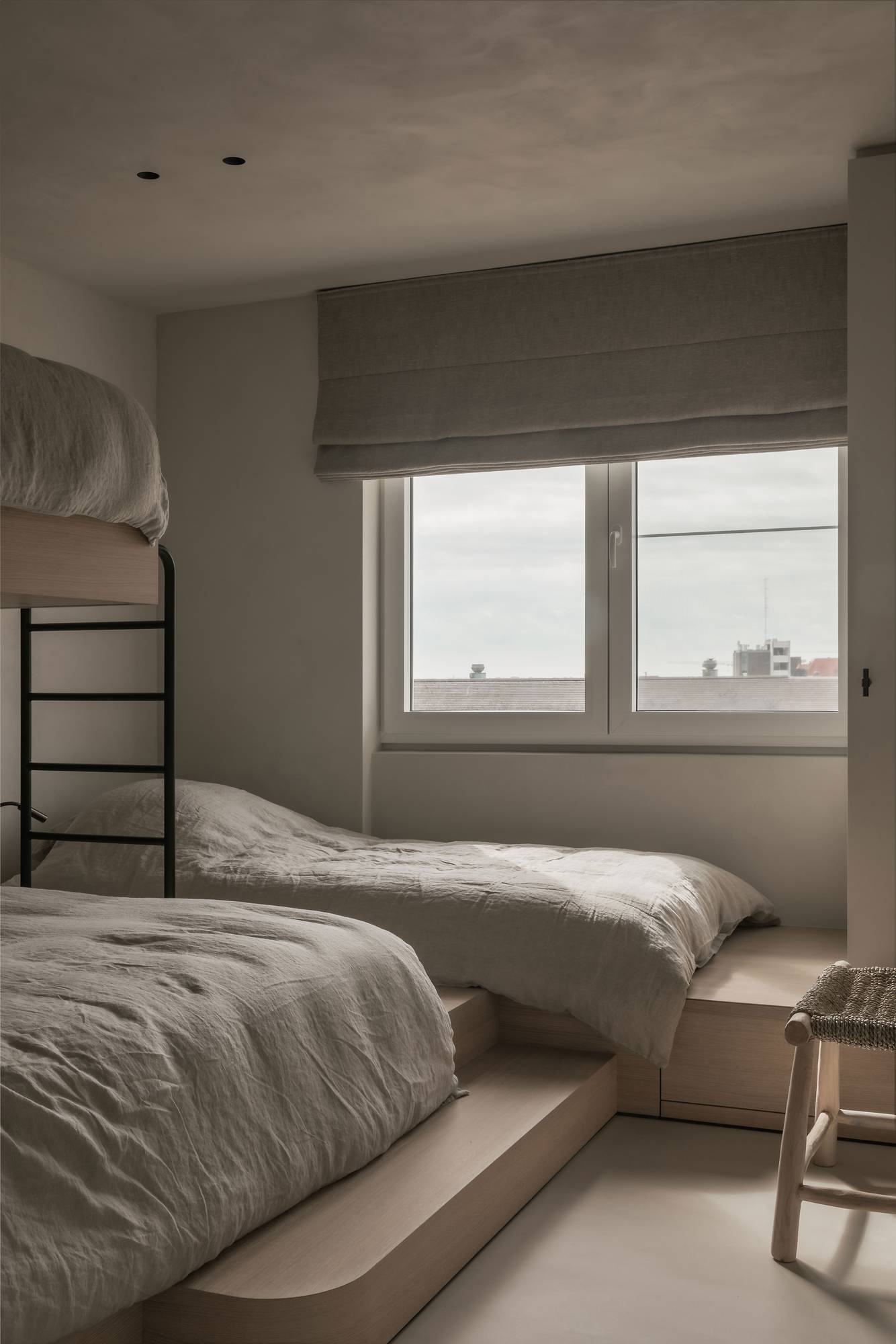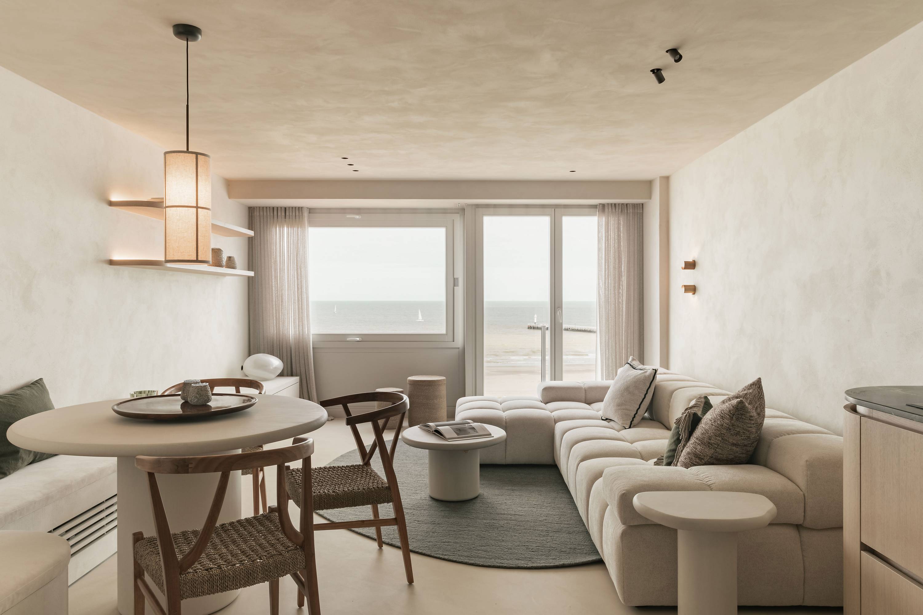 De keuze voor deze minerale harsvloer was doordacht. Dit type vloerafwerking heeft de uitstraling van gepolierd beton, maar voelt verfijnder en natuurlijker aan. De subtiele nuances en zachte textuur zorgen voor een genuanceerde look, zonder in te boeten op onderhoudsgemak. Dat is een grote troef, zeker in een kustappartement waar zand en vocht dagelijks aanwezig zijn.
