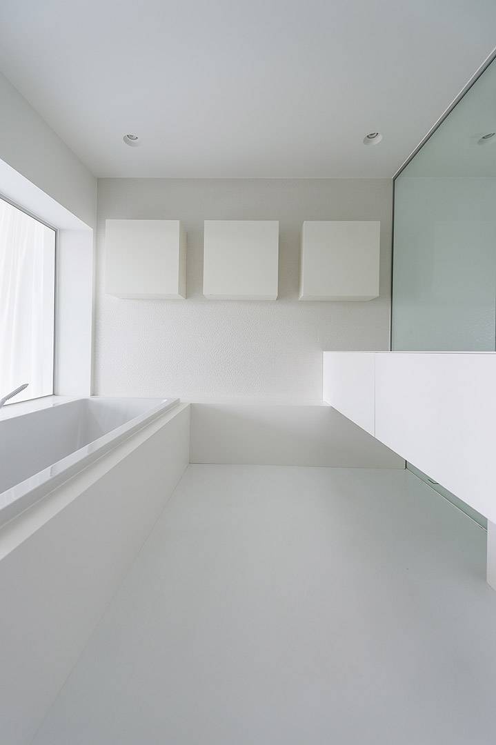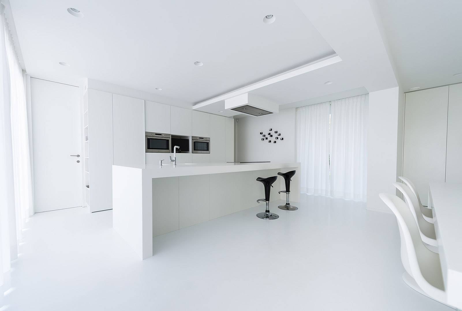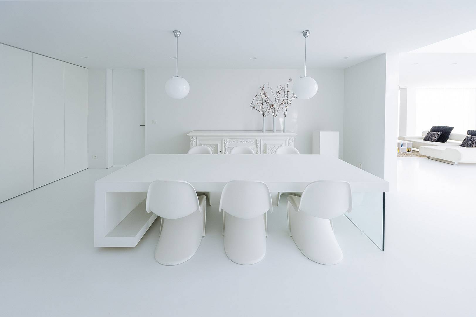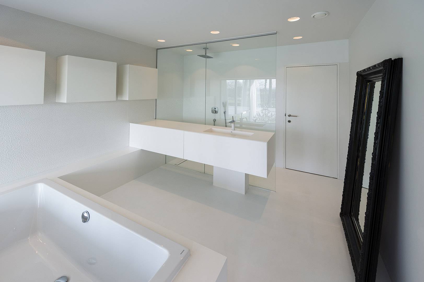 In deze gezinswoning werd voor een tamelijk witte Liquid Mellow gekozen. Met de nauwkeurig geselecteerde designelementen, ook al in verschillende tinten wit, vormt de vloer een prachtig geheel, van de leefruimte tot de slaapkamers. Op beide zijden van de Liquid Steps werd indirecte LED-verlichting geïnstalleerd. Het resultaat? Een visueel pareltje. In de badkamer steelt de enorme Liquid Bathing-inloopdouche met ingewerkte glazen wand de show.