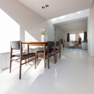 In deze compacte rijwoning in Aalst werkt de Mellow in de eerste plaats verruimend. De lichte en strakke gietvloer zorgt samen met de metershoge ramen aan de zuidkant van de woning voor het gevoel van openheid en ruimte. De eigenaars combineerden de naadloze Mellow met enkele zorgvuldig uitgekozen vintage meubels en accessoires. Het zorgt voor een unieke sfeer in huis.