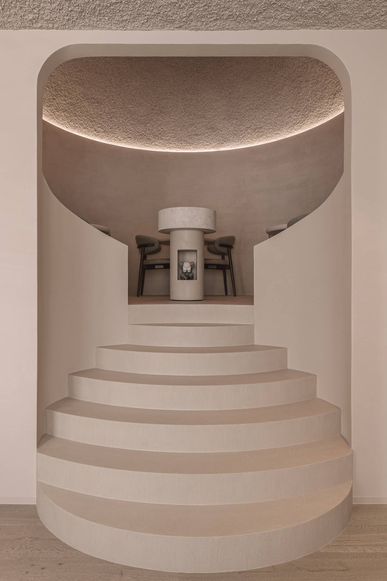 Een van de meest opvallende toepassingen van deze grove minerale harsvloer, zijn de trappen die doorlopen naar de eetruimte onder een koepel. Hier geeft de vloer niet enkel een robuuste en eigentijdse uitstraling, ook vormt het een boeiend contrast met Thalostuc van Odilon Creations dat hier op de wanden werd geplaatst.