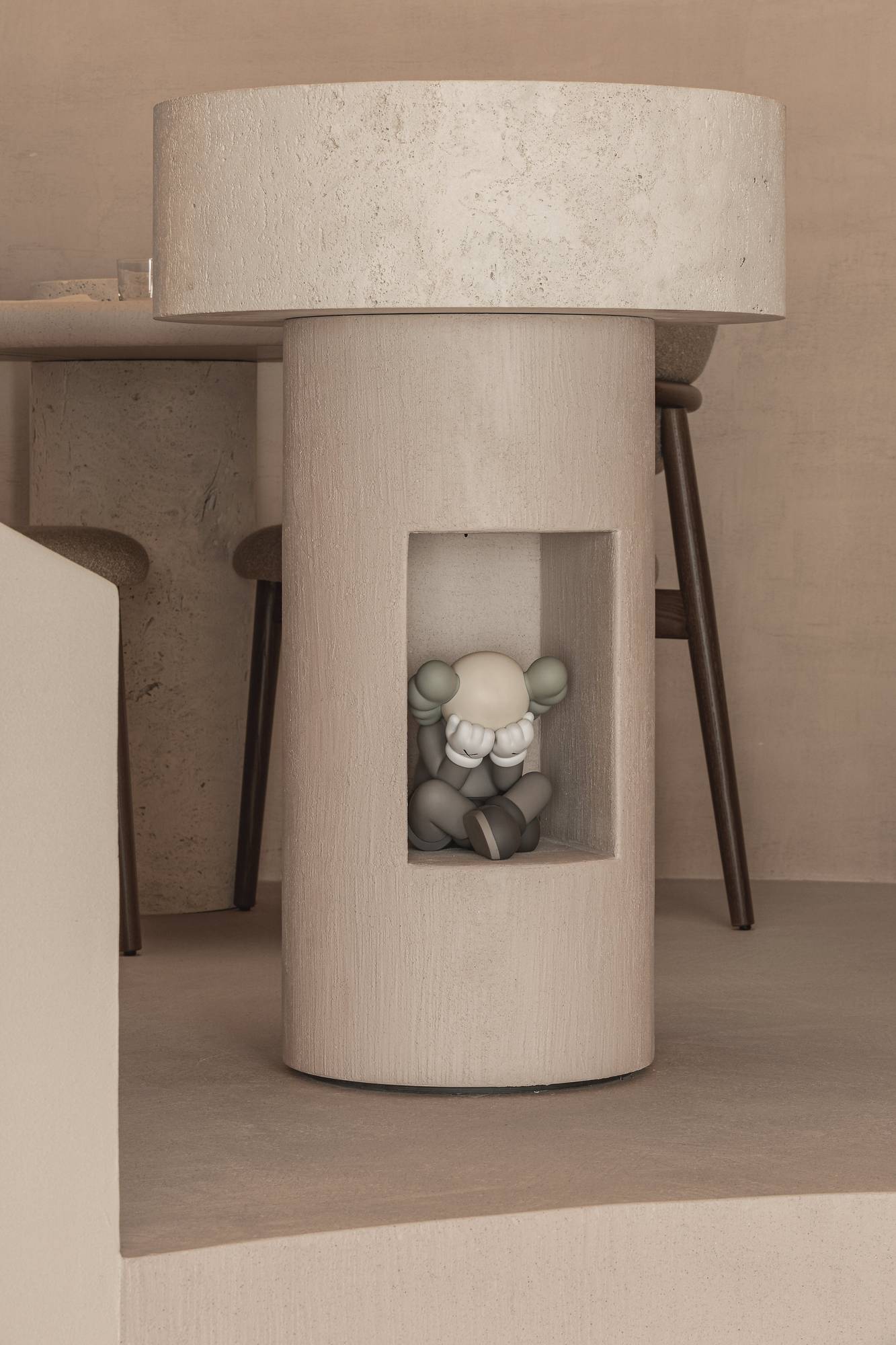 Deze veelzijdige afwerking gaat echter verder dan enkel vloeren en muren, Carran drukt ook zijn stempel op het maatmeubilair. Zo wordt je in stijl ontvangen dankzij de inkombalie waar Carran de rondingen van dit designermeubel omarmt. Alsook de tafelbladen die een ruwe, verfijnde textuur krijgen voor een extra tactiele dimensie tijdens het dineren.