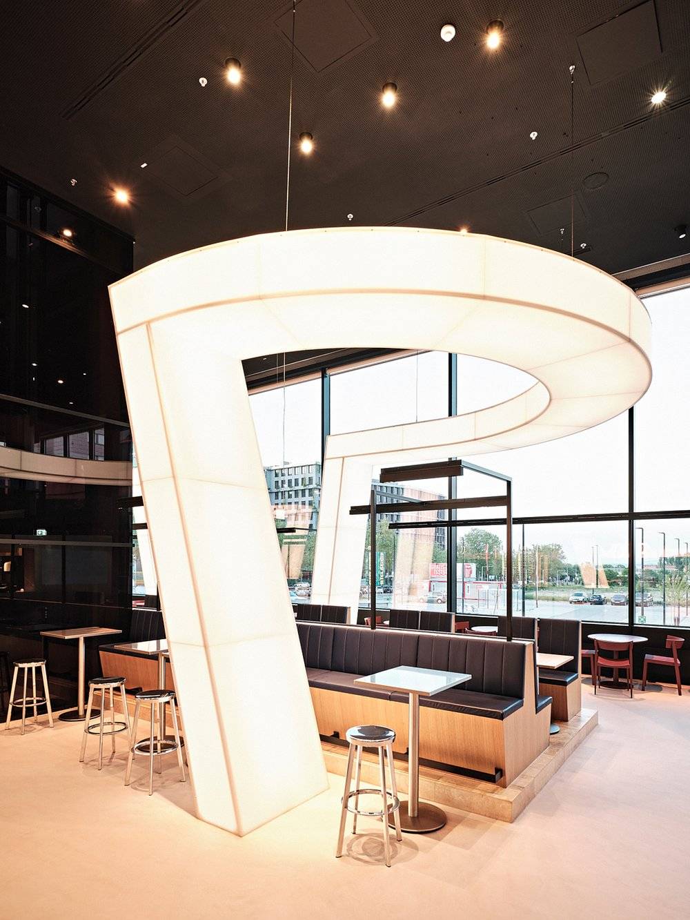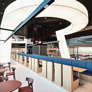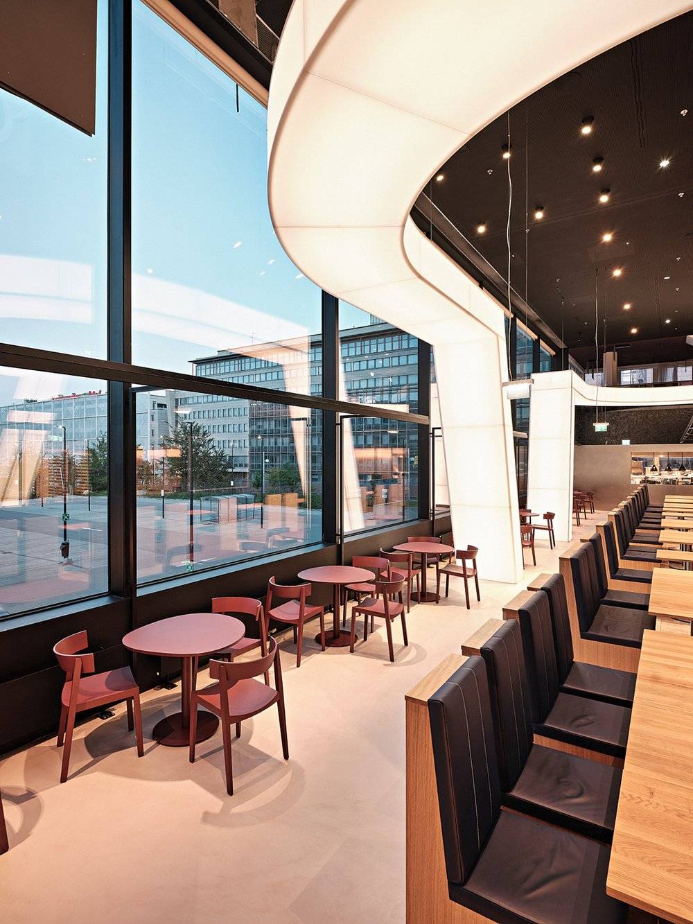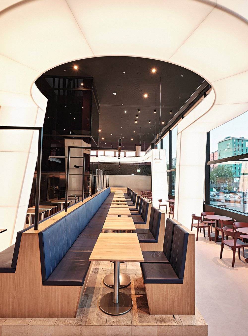 Celý interiér dizajnéri dotvorili dominantným svetelným objektom, travertínovou plošinou a nábytkom z rôznych materiálov a sýtych farieb. Práve krásny odtieň liatej podlahy zjemňuje kontrast ostatných prvkov reštaurácie.