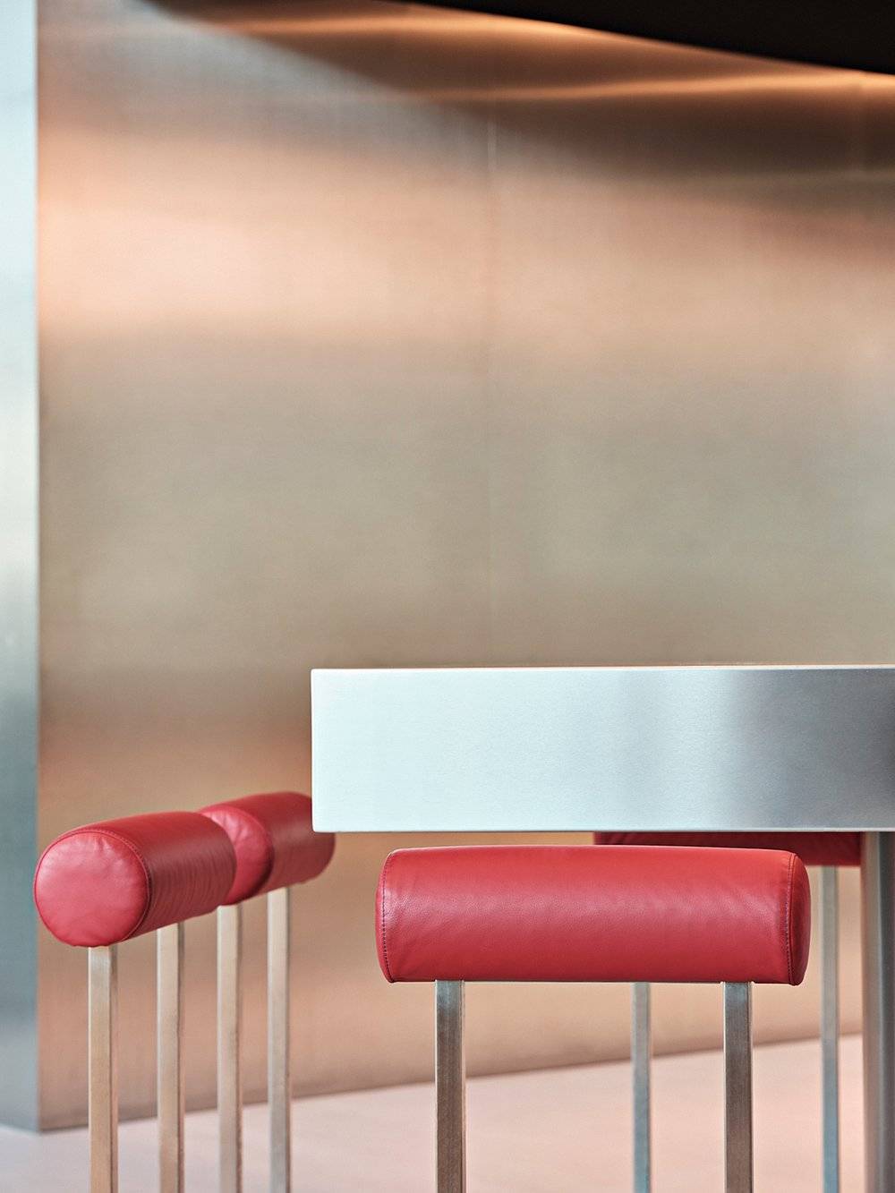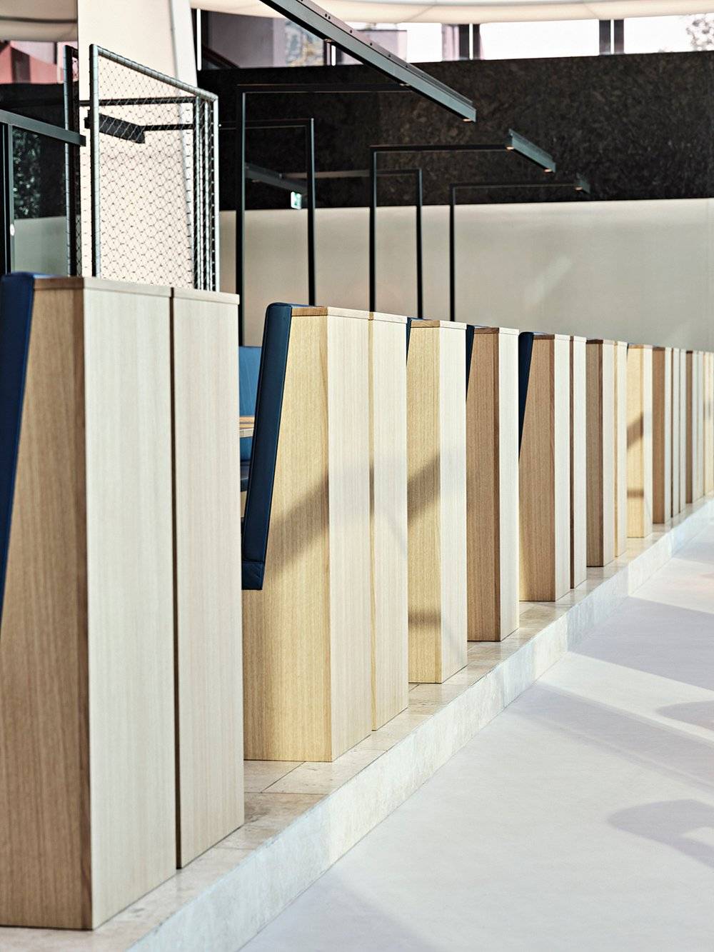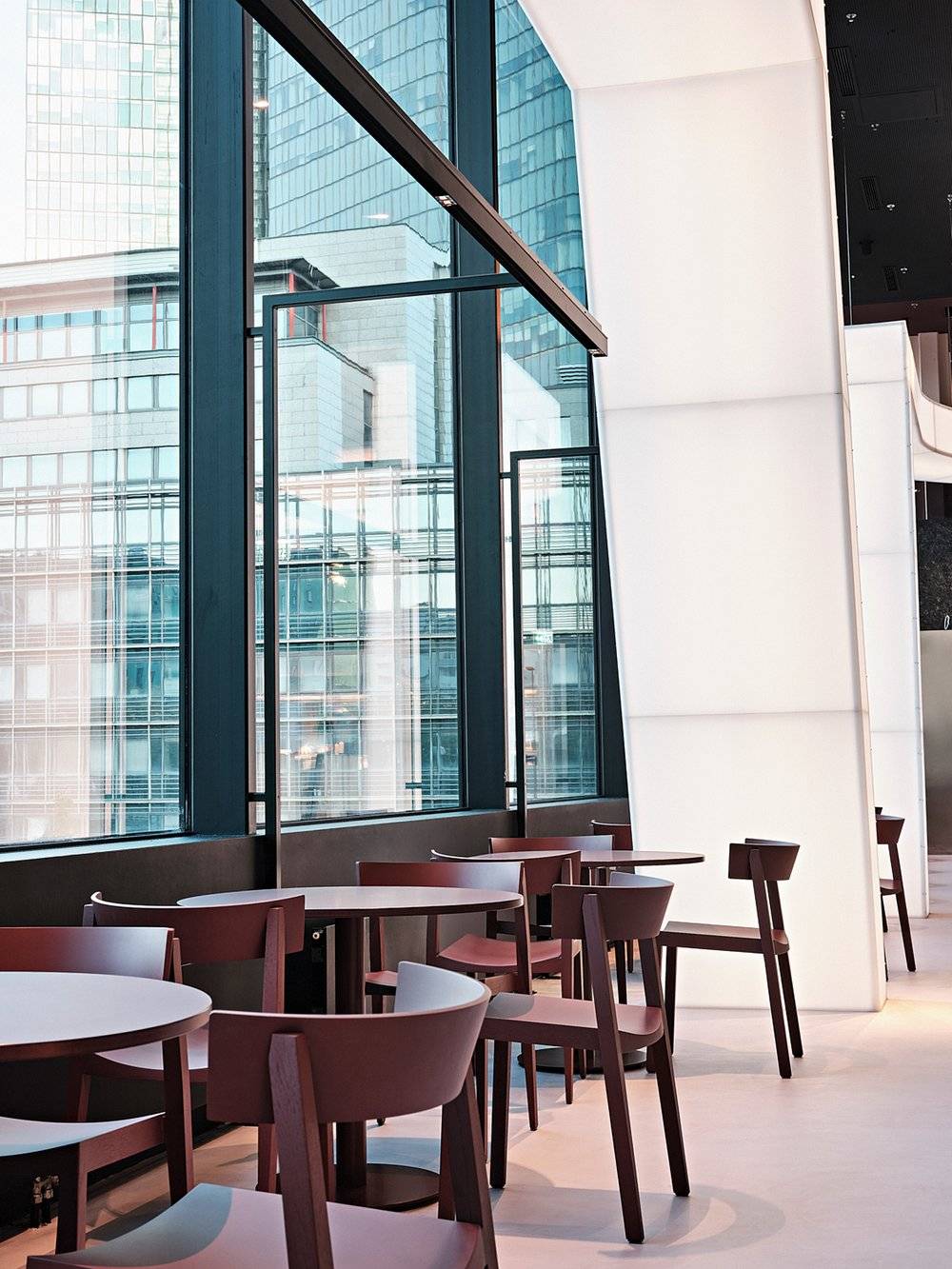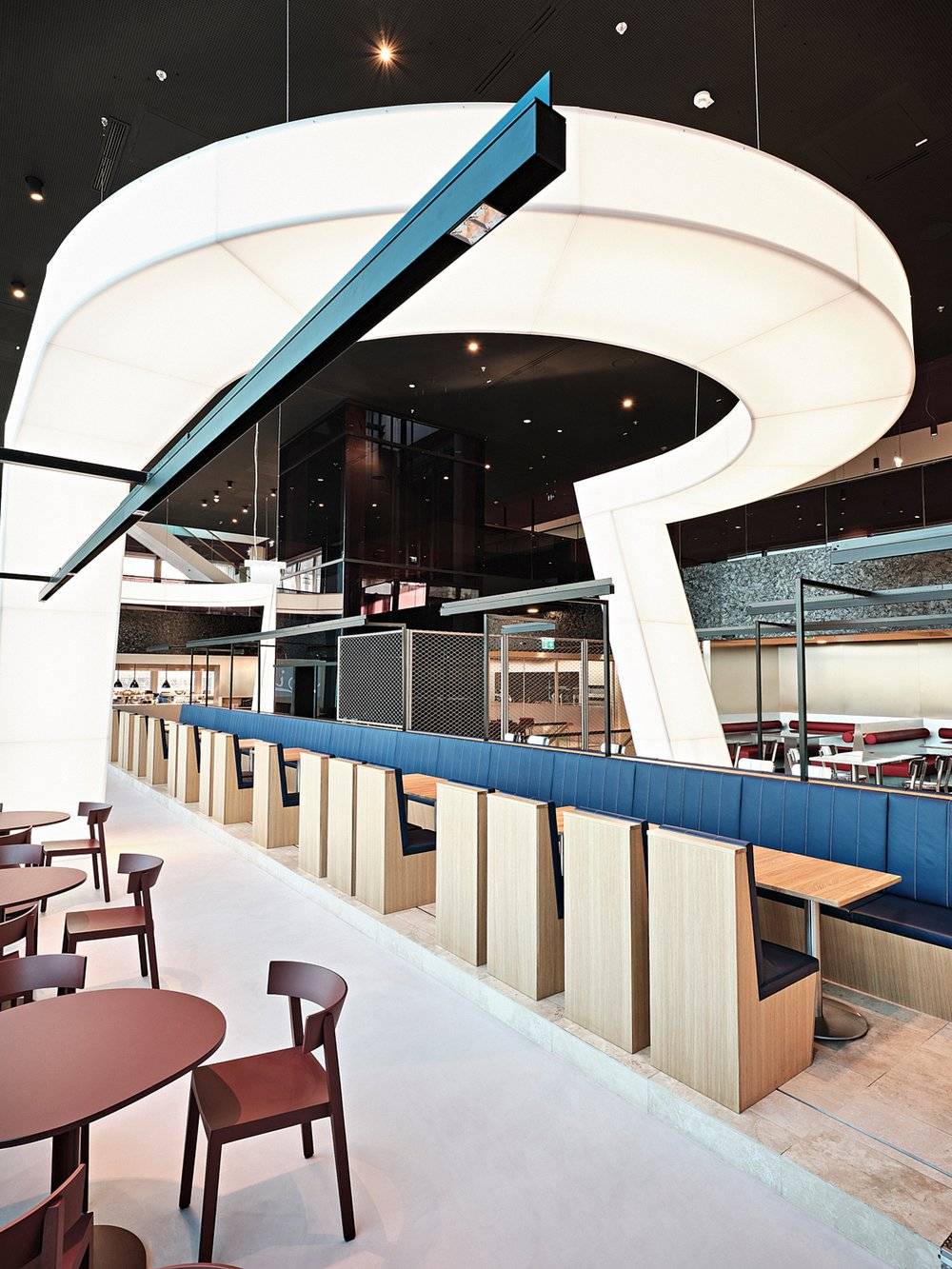 Celý interiér dizajnéri dotvorili dominantným svetelným objektom, travertínovou plošinou a nábytkom z rôznych materiálov a sýtych farieb. Práve krásny odtieň liatej podlahy zjemňuje kontrast ostatných prvkov reštaurácie.